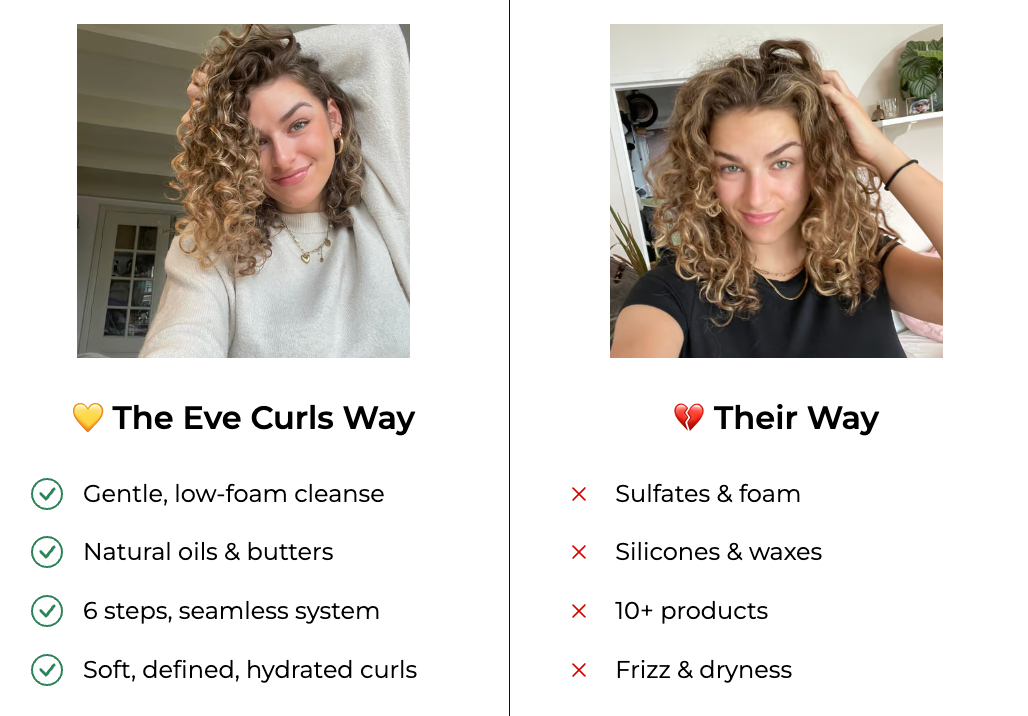 Sure, your hair looks smooth right after washing — but that fake shine comes from plastic-like silicones that coat the hair and block real moisture from getting in. Over time, your curls get drier underneath the surface, leading to frizz, breakage, and dullness.